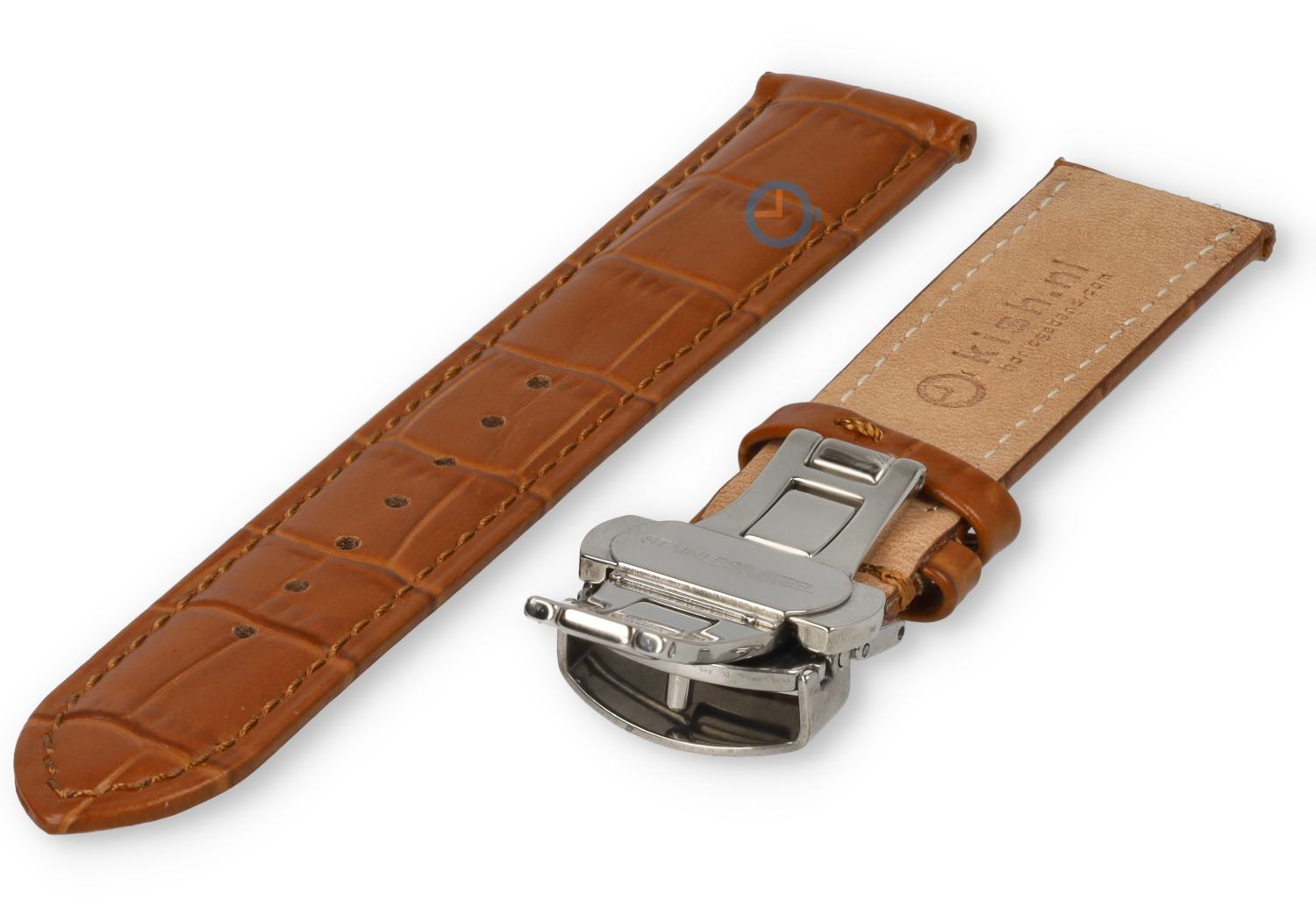 19mm Uhrenarmband aus Kroko Leder mit hochwertiger Schmetterlingsfaltschließecognacbraun. Dieses Uhrenarmband hat eine ungerade Größe: 19mm. Das Leder hat ein Luxus Krokomuster gestanst und hat eine klassische Ton-in-Ton Naht.