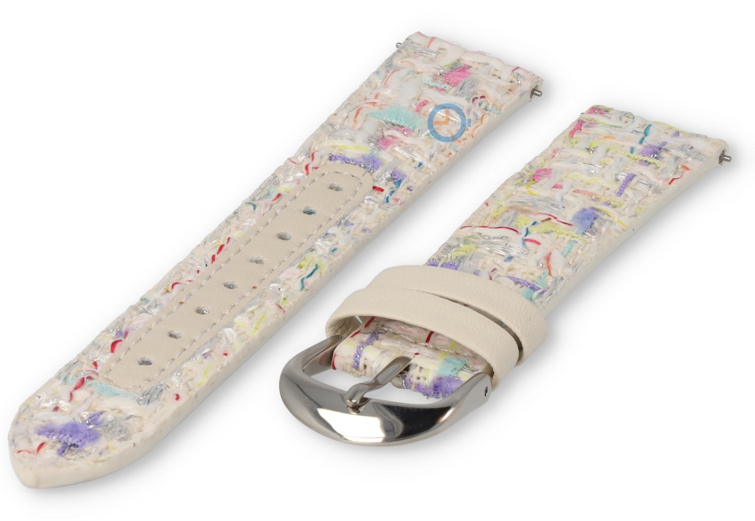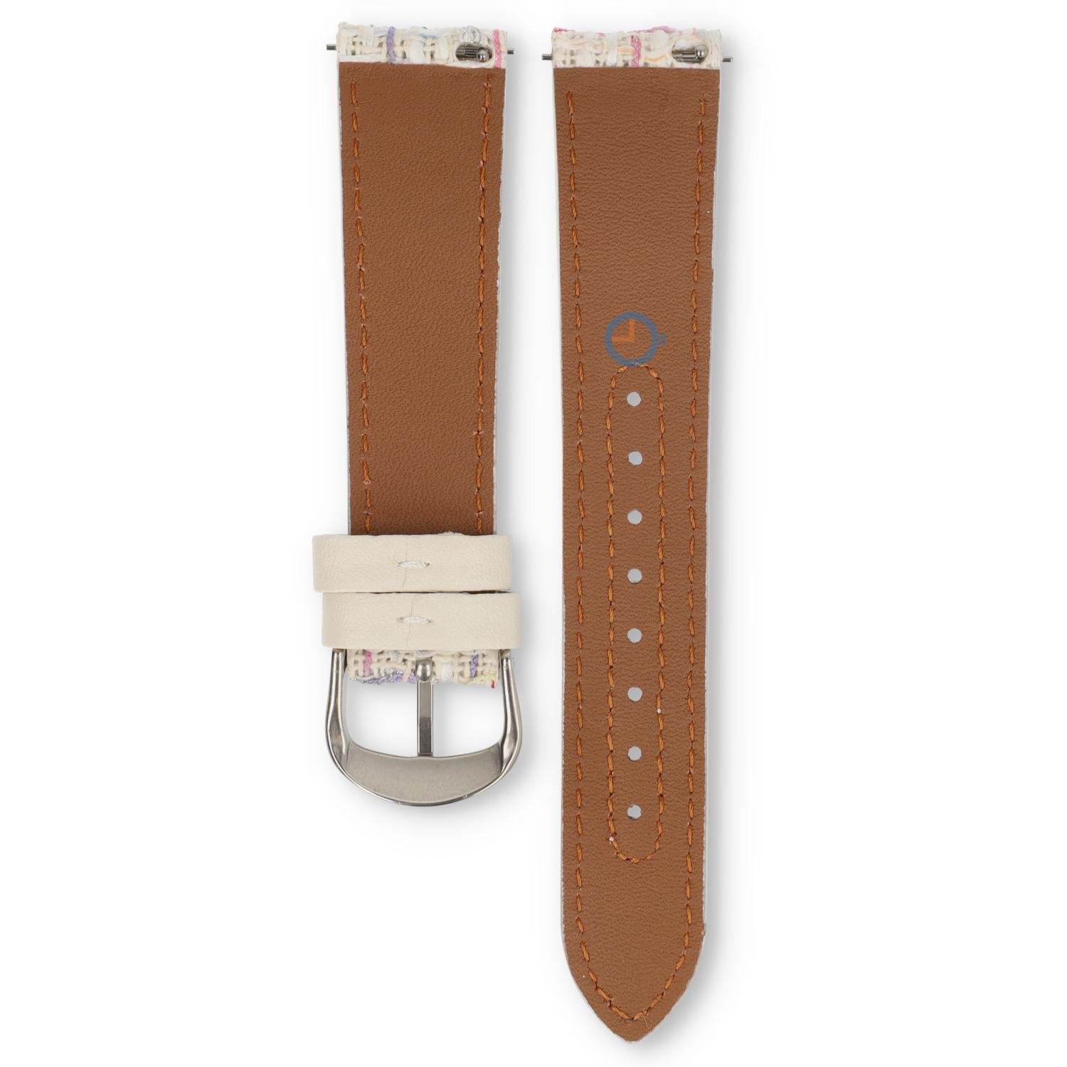 Ein wunderschönes 20mm Uhrenarmband aus Leder und Stoff mit vielen Farben. Dieses bunte Band hat eine Basis aus PU-Leder und eine obere Schicht aus gewebtem Stoff. In das Uhrenarmband ist ein Quick-Switch Stift integriert, sodass Sie das Band schnell wechseln können.