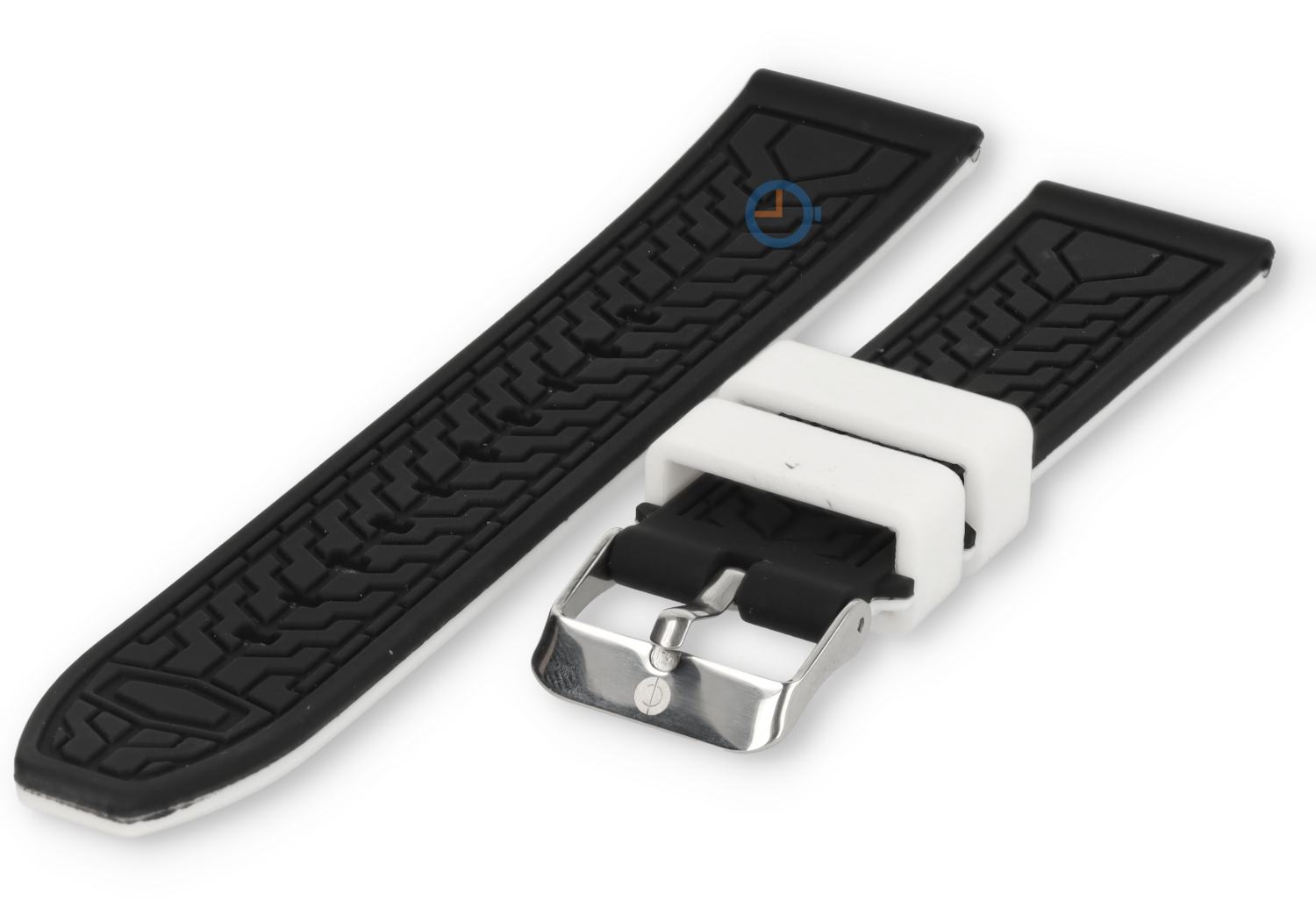 Machen Sie Ihre Armbanduhr zum echten Hingucker! Dieses wendbare Uhrenarmband hat an beiden Seiten einen sportlichen Look. Das Weiße Uhrenarmband hat zwei schwarze Linien und auf der anderen Seite ein graues Bandmotiv.