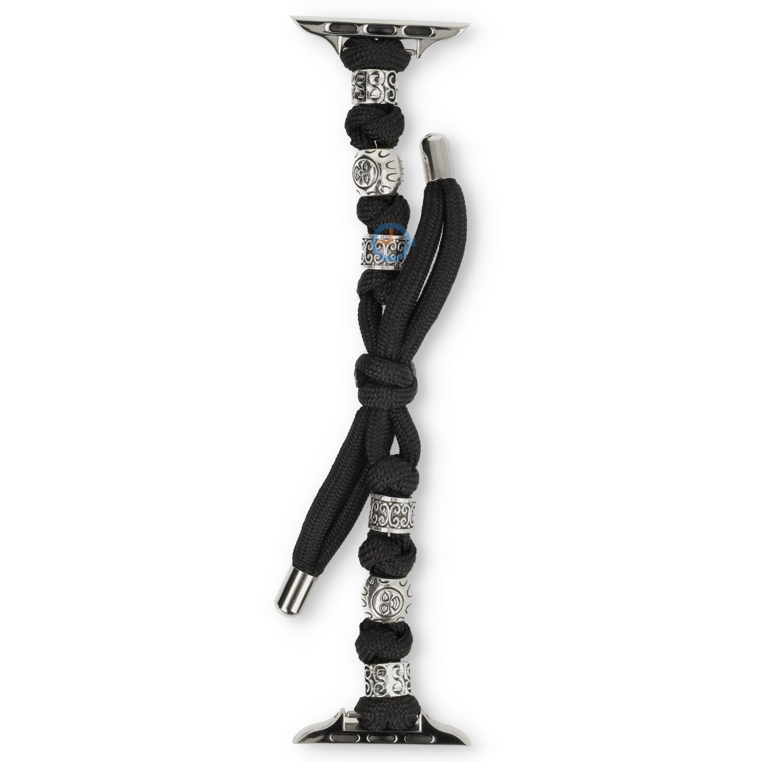 Dies ist ein speziell entworfenes Uhrenarmband für die Apple Watch 41mm, hergestellt aus stabiler Schnur mit geknoteten Details. Die Stahl Charms sind versehen von feiner Gravur, welches das Band eine künstlerische, Bohemian Ausstrahlung verleiht. jeder Charm sitzt zwischen Knoten, wodurch das Band nicht nur schön aussieht, sondern auch gut sitzt.