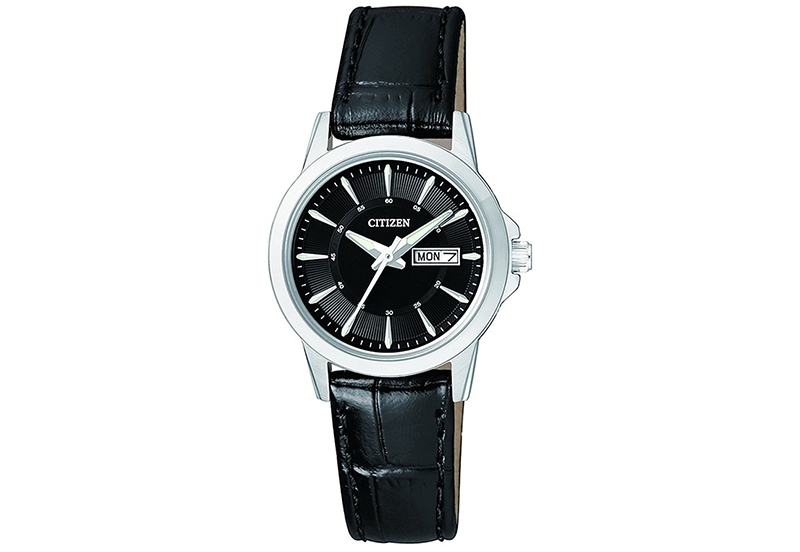 Originales Citizen Uhrenarmband für das Modell EQ0601 - 03EE. Schmales schwarzes Kroko - Optik Uhrenarmband für Damen. Zeitloses und schickes Armband passend zum Modell EQ0601 - 03EE. Dieses Armband wird mit einer silbernen Schnalle geschlossen.