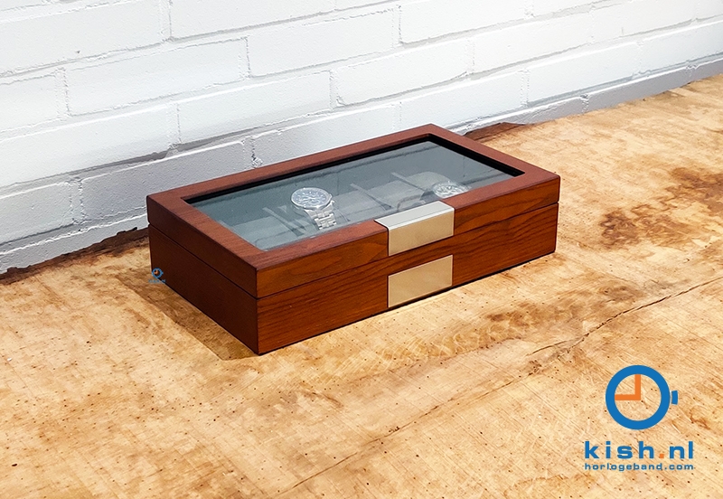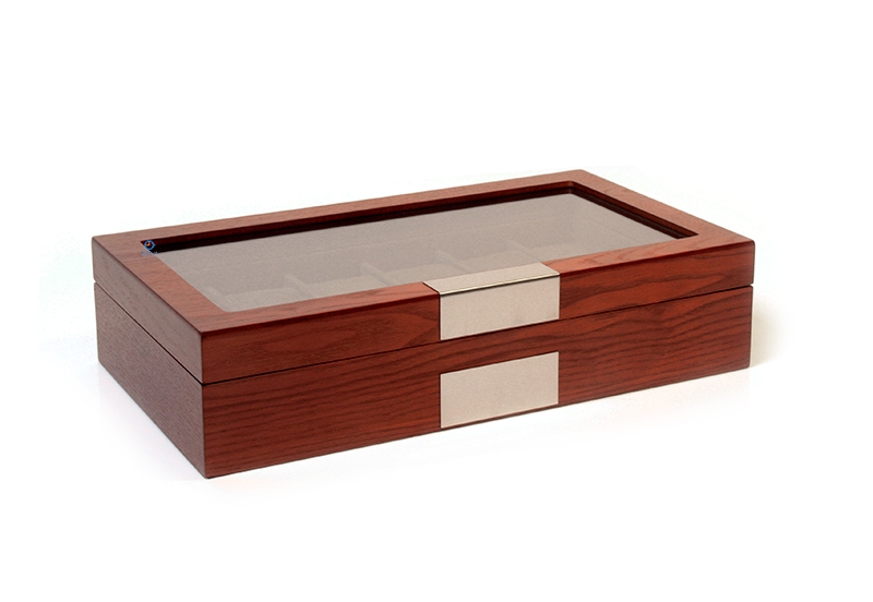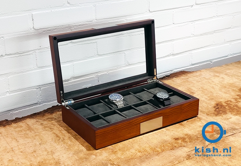 Diese holz Uhrenbox ist von innen grau mit grauem Velours, welches super gut hamoniert mit dem designvollem Äußeren. Bewahren Sie Ihre Uhren stilvoll auf in dieser Uhrenbox, die bis ins Detail ausgearbeitet ist. Der matte Lack und die rostfreie Platte machen die Box komplett!