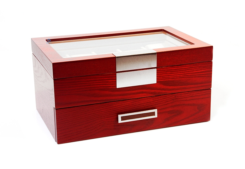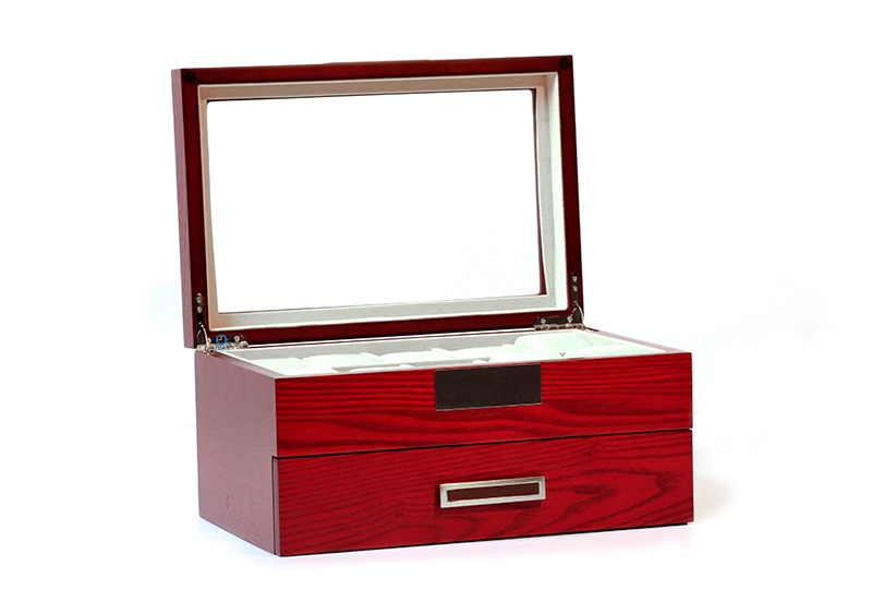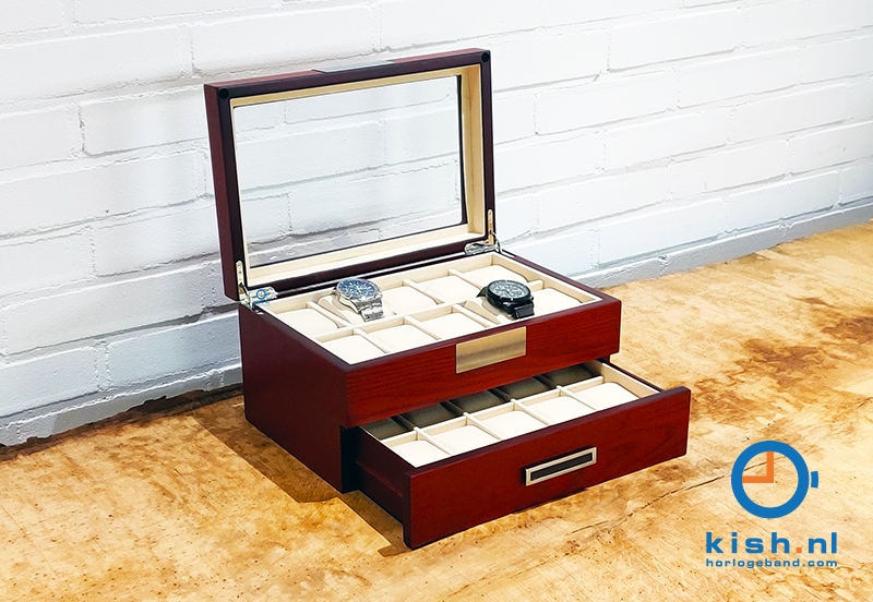 Diese Uhrenbox bietet Platz für 20 Uhren, verteilt rüber 2 Etagen. Durch die freiräume zwischen den Kissen und den Deckel, kommen die uhren nicht in Berührung mit dem Fenster und somit verhindert man Beschädigungen.