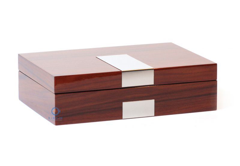 Das dunkele Holz harmoniert sehr schön mit der stahlen Verzierung auf dem Deckel. Auch passt die Innenbekleidung aus beigen Velours sehr gut zu dieser edelen Box. Ein richtiges Musthave für Armbanduhren-Liebhaber.