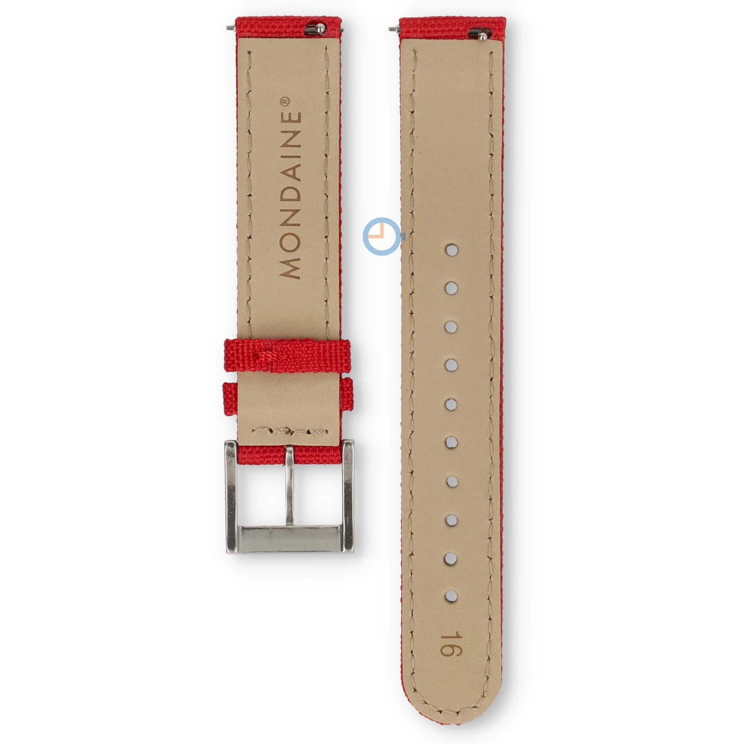 Uhrenarmband Mondaine aus Leder mit Nylon Beschichtung. Nylon ist ein sehr starkes Material, wodurch es nicht schnell abnutzt. Auch ist es ein sehr belastbares Material. Das Leder wird sich das Armband Ihrem Handgelenk anpassen und dadurch sehr angenehm im Tragen.