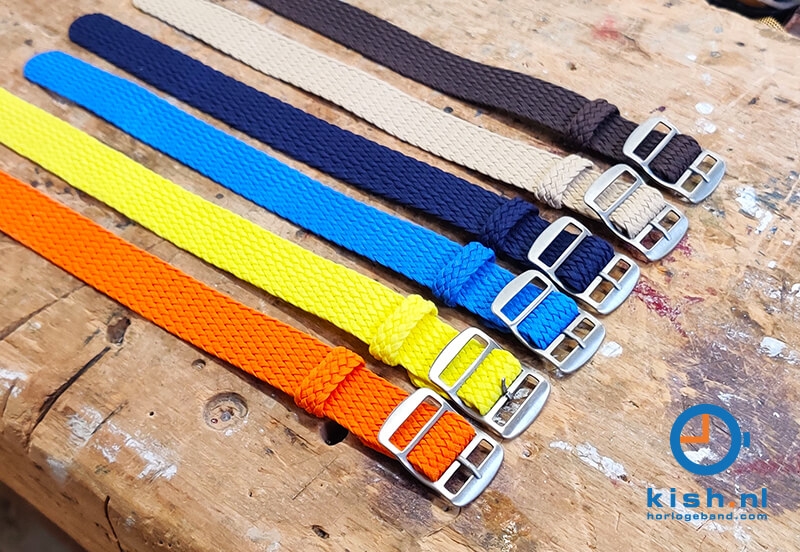 Perlon ist eine super starke Kunststofffaser, die verwant ist mit Nylon. Dieses Material wird u.a. verarbeitet in Fallschirmen und in Seilen der Luftwaffe und Marine. Das geflochtene Uhrenarmband kann einige Stöße ab und ist wasserfest. Die Ränder von dem Uhrenarmband wurden mit einem Laser bearbeitet, dadurch fransen die Ränder vom Armband nicht aus.