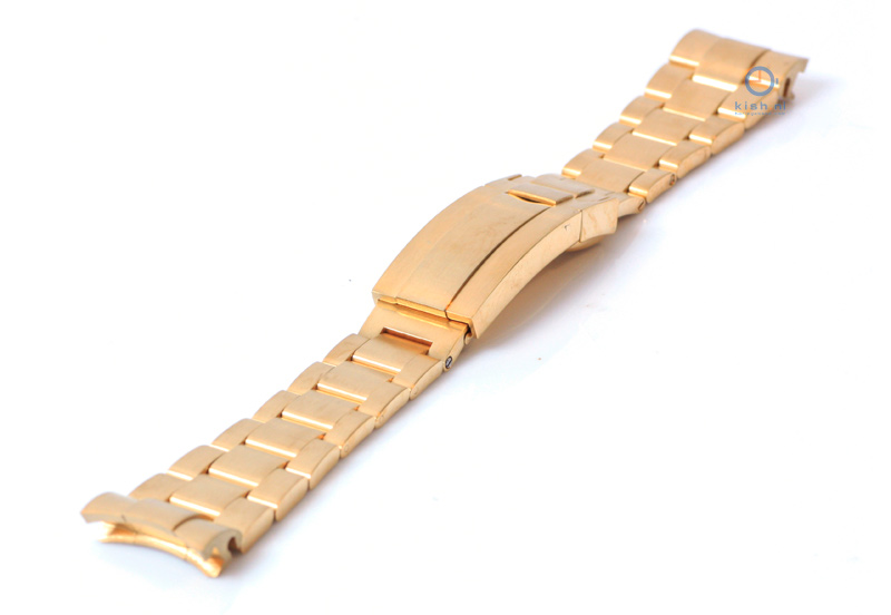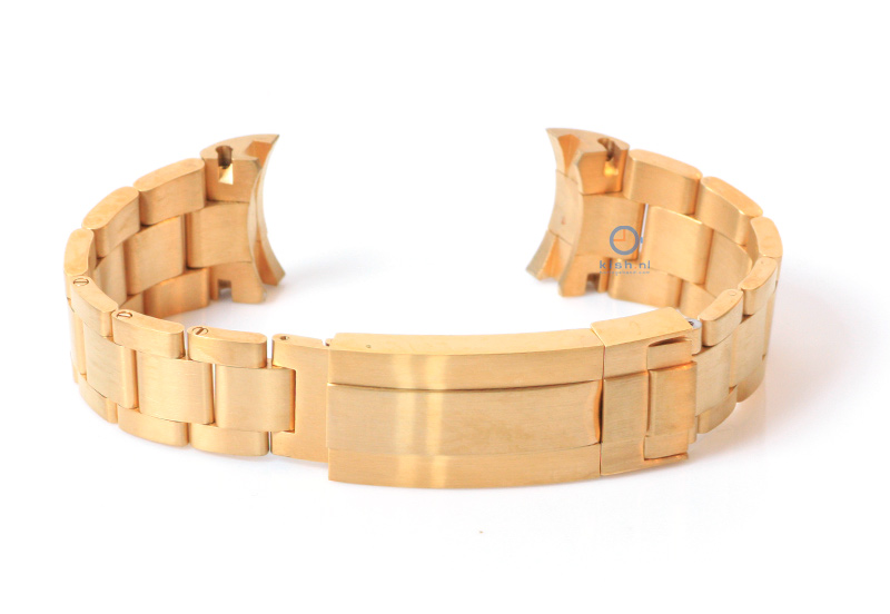 Uhrenarmband 21mm Rolex Stil. Dieses goldene Edelstahl Uhrenarmband hat einen runden Anschluss, sodass es perfekt am Uhrengehäuse anschließt.
