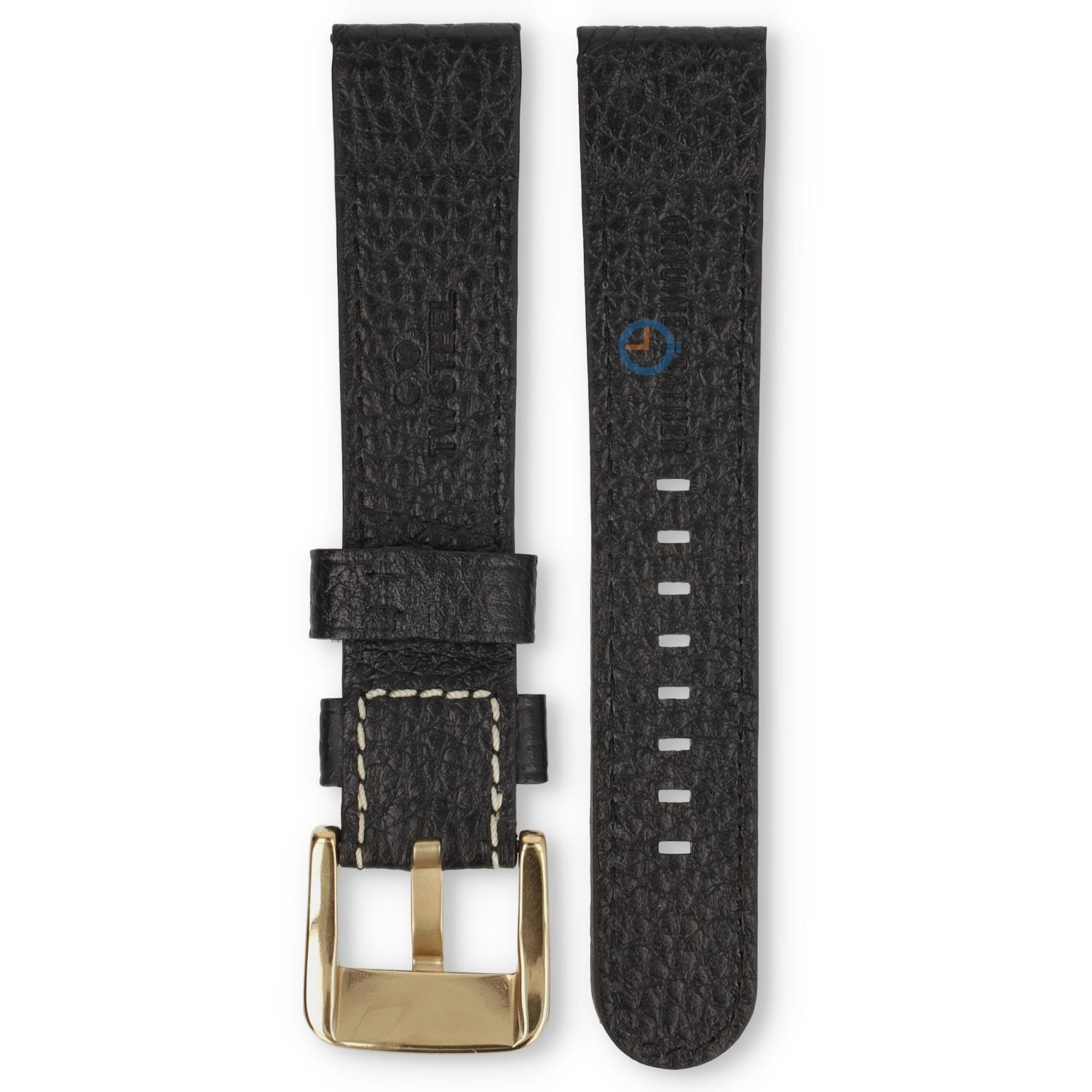 Originales TW Steel Uhrenarmband TWB25L. Dieses schöne Leder-Uhrenarmband ist verziert mit goldenen Nieten und einer weißen Naht, dadurch bekommt es eine coole und robuste Ausstrahlung. Man schließt das Armband mit einer goldenen Schnalle.
