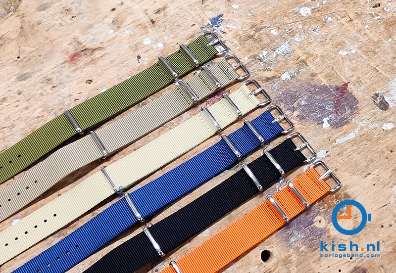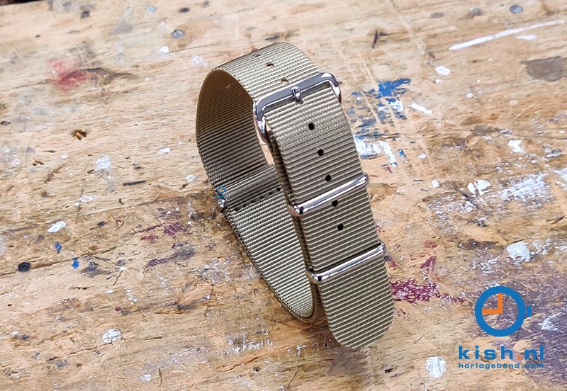 Textil Nato Band - beige. Dieses universelle Nato - Uhrenarmband ist aus ironclad gewebtem Nylon gefertigt. Das Nylonband verhindert, dass das Uhrengehäuse die Haut berührt und sorgt für Stabilität beim Tragen. Dieses Uhrenarmband ist aus einem Strück gefertigt und hat eine Einschubbefestigung. Schieben Sie das Armband durch die Federstege, die am Uhrengehäuse befestigt sind. Ziehen Sie es dann durch die verbleibende Klappe. Dadurch wird verhindert, dass die Uhr vom Band rutscht.