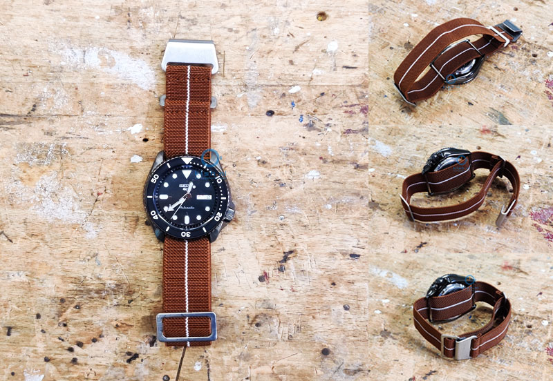 Uhrarmband 21mm Elastisch nylon Braun - Weiß. Ein look - a - like Erika ersatzband. Das 21mm Uhrarmband ist Braun und hatte ein Weiße Centerline.