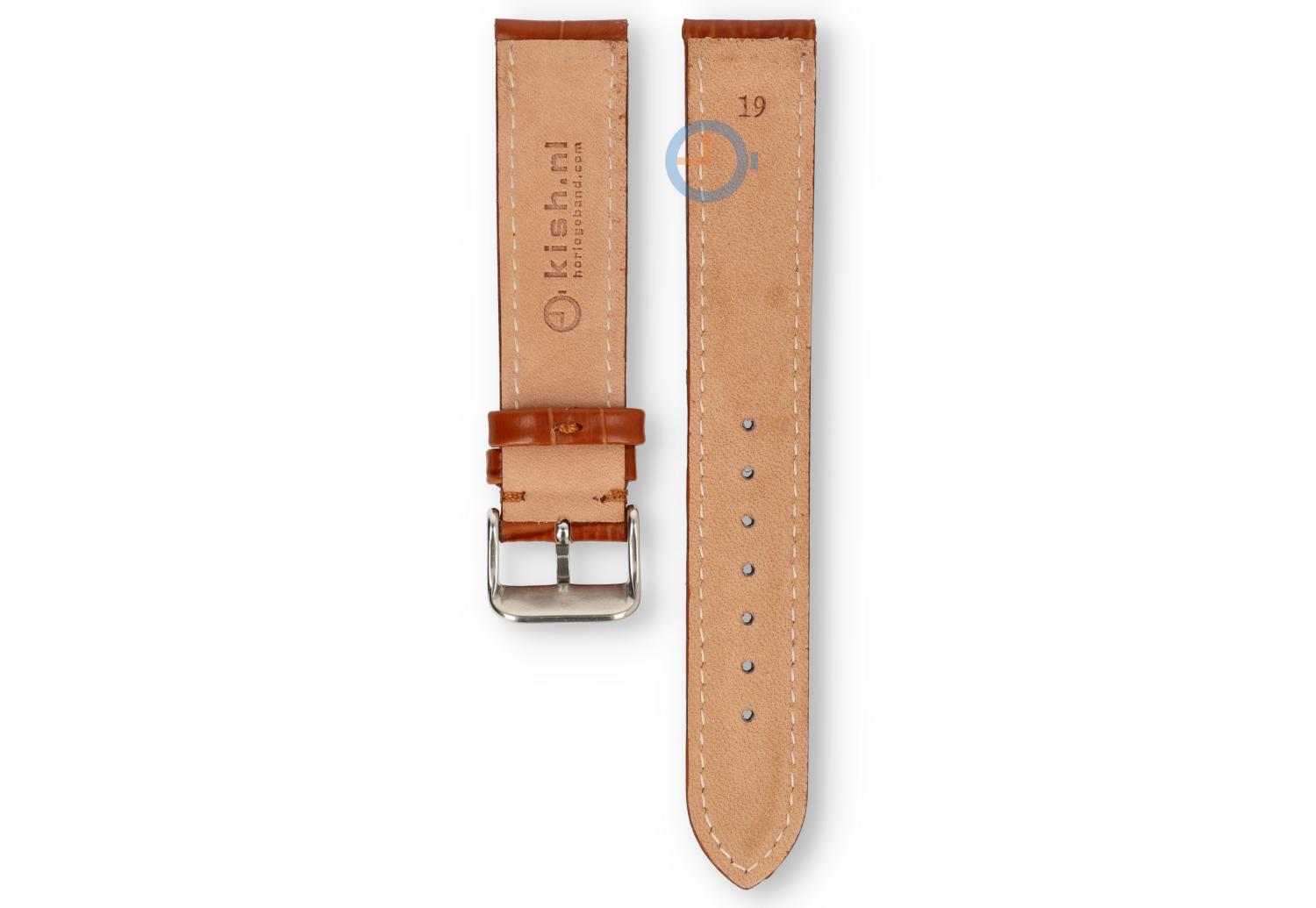 19mm Uhrenarmband aus Kroko Leder - cognacbraun. Dieses Uhrenarmband hat eine ungerade Größe: 19mm. Kommt nicht oft vor und dadurch sehr schwer zu finden. Uhrenarmbandshop.de hat inzwischen ein ziemliches Sortiment in ungeraden Größen. So auch dieses schöne Leder Armband. Das Leder ist matt und hat eine coole weiße Naht. Die Dornschließe ist hochglanz und wird montiert mitgeliefert.