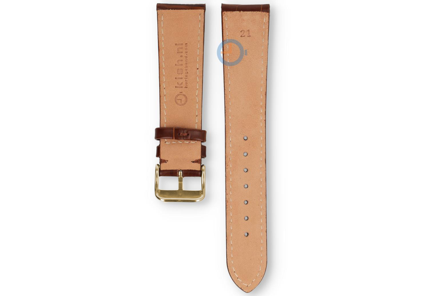 21mm Uhrenarmband aus Kroko Leder - dunkelbraun. Dieses Uhrenarmband hat eine ungerade Größe: 21mm. Kommt nicht oft vor und dadurch sehr schwer zu finden. Uhrenarmbandshop.de hat inzwischen ein ziemliches Sortiment in ungeraden Größen. So auch dieses schöne Leder Armband. Das Leder ist matt und hat eine coole weiße Naht. Die golden Dornschließe ist hochglanz und wird montiert mitgeliefert.