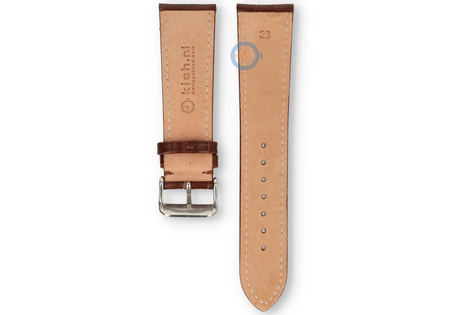 23mm Uhrenarmband aus Kroko Leder - cognacbraun. Dieses Uhrenarmband hat eine ungerade Größe: 23mm. Kommt nicht oft vor und dadurch sehr schwer zu finden. Uhrenarmbandshop.de hat inzwischen ein ziemliches Sortiment in ungeraden Größen. So auch dieses schöne Leder Armband. Das Leder ist matt und hat eine coole weiße Naht. Die Dornschließe ist hochglanz und wird montiert mitgeliefert.