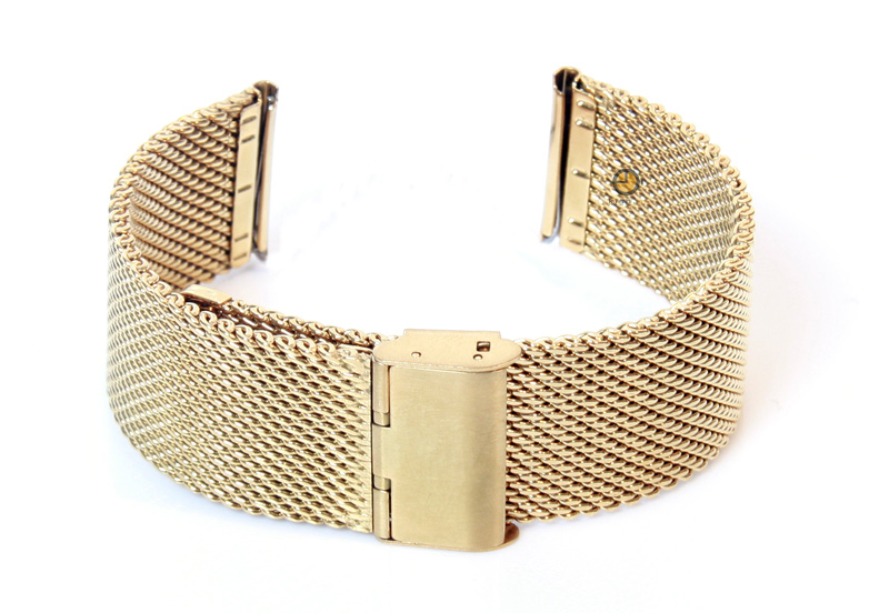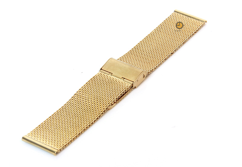 Uhrenarmband 24mm Gold Mailänder Stahl. Das Armband wird mit Federstegen befestigt. Diese können Sie einfach selbst an der Uhr montieren. Mit einem Werkzeug zum Entfernen des Federstegs ist der Austausch des Uhrenarmbandes viel einfacher.