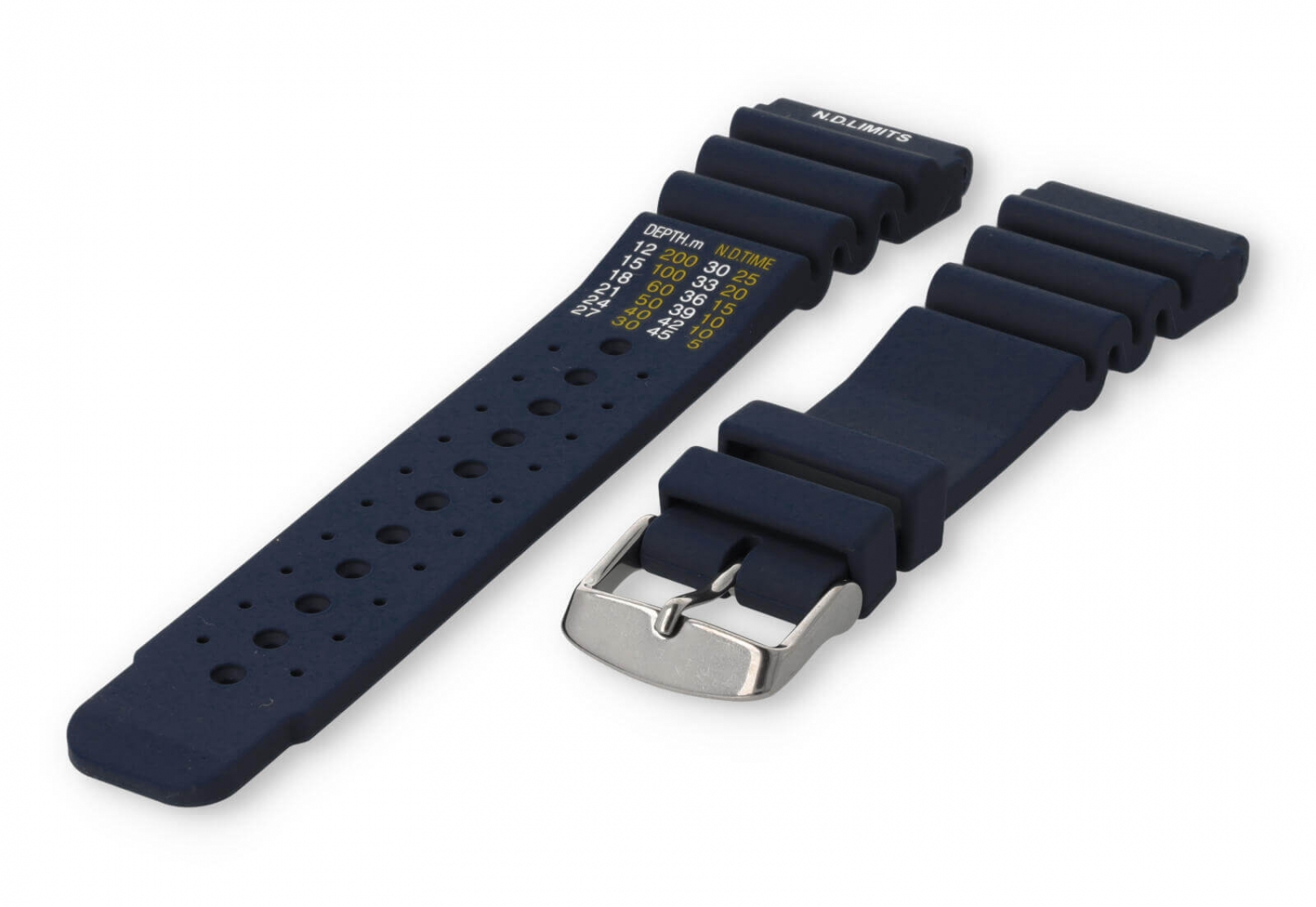 Dies ist ein stabiles Uhrenarmband, dass einiges an Druck vertragen kann. Große und schwere Tauchuhren sind für dieses Band gar kein Problem. Das Armband ist komplett wasserfest und rostfrei. Dieses Kunststoff Uhrenarmband hat eine gedruckte Tauchtabelle auf dem Band. Die Zeiten auf dem Uhrenarmband sind als Verschönerung. Die Tauchzeiten wurden nämlich bearbeitet und stimmen nicht mehr überein mit den internationalen Sicherheitsbeschreibungen.