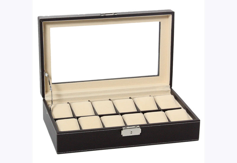 Uhrenbox 12 Strück dunkelbraunes Leder. Eine abschließbare Uhrenbox aus Kunstleder. Diese Uhrenbox bietet Platz für 12 Uhren. Jede Uhr wird in einem eigenen Fach aufbewahrt, so dass die Uhren sich nicht gegenseitig beschädigen können. Bitte sehen Sie sich alle Uhrenboxen aus Holzin unserem Shop an.