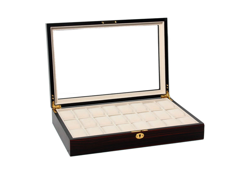 Exklusive Holz-Uhrenbox, gemacht um 24 Uhren aufzubewahren. Hergestellt aus zertifiziertem MDF Holz mit weichem Velours Material an der Innenseite. Der Deckel ist versehen mit Mineral-Glas und einem langlebigen Schloss mit Schlrüssel.Schauen Sie sich alle unsere Uhrenboxen an in unserem Shop!