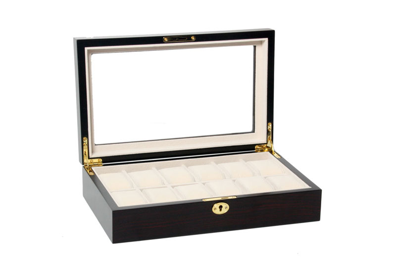Uhrenbox für 12 Uhren ebony. Ein abschließbare Uhrenbox aus Holz. Diese Uhrenbox bietet Platz für 12 Uhren. Jede Uhr wird in einem eigenen Fach aufbewahrt, so dass die Uhren sich nicht gegenseitig beschädigen können. Bitte sehen Sie sich alle Uhrenboxen aus Holz in unserem Shop an.