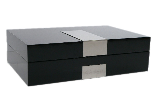 Gisoni Padula Uhrenbox in hochglanz schwarz. Diese Holz-Uhrenbox ist bis ins kleinste Detail verarbeitet und bearbeitet mit einem hochglanz Lack. Zu dieser hochglanz Box passt die gebrürstete RVS Platte, die befestigt wird auf der Box, sehr gut. Die Uhrenbox sieht modern und schick zu gleich aus. In dieser Uhrenbox können Sie bis zu 8 große Uhren aufbewahren. Die Kissenmaße sind nämlich 62,5mm!